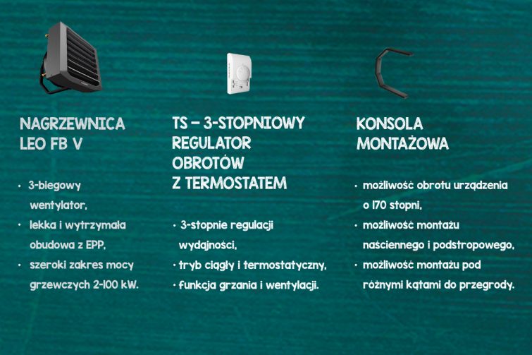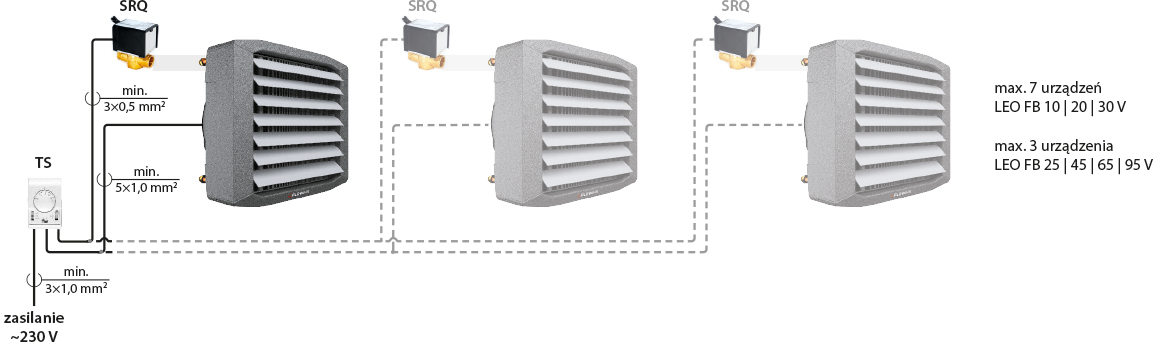 Nowy spos贸b zasilania urz膮dze艅 pozwala na obs艂ug臋 za pomoc膮 jednego regulatora kilku urz膮dze艅. Na przyk艂ad, jeden regulator TS mo偶e sterowa膰 prac膮 a偶 7 nagrzewnic LEO FB 10|20|30 V lub 3 nagrzewnic LEO FB 25|45|65|95 V. Oczywi艣cie takie rozwi膮zanie w znacznym stopniu przek艂ada si臋 na obni偶enie koszt贸w inwestycyjnych zwi膮zanych z uk艂adem sterowania oraz instalacj膮 na obiekcie. Obs艂uga urz膮dze艅 jest r贸wnie偶 艂atwiejsza gdy偶 z jednego miejsca mo偶na zmieni膰 parametry pracy kilku nagrzewnic jednocze艣nie.