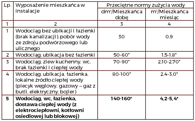 Tabela 1. Przeciętne normy zużycia wody na jednego mieszkańca w gospodarstwach domowych