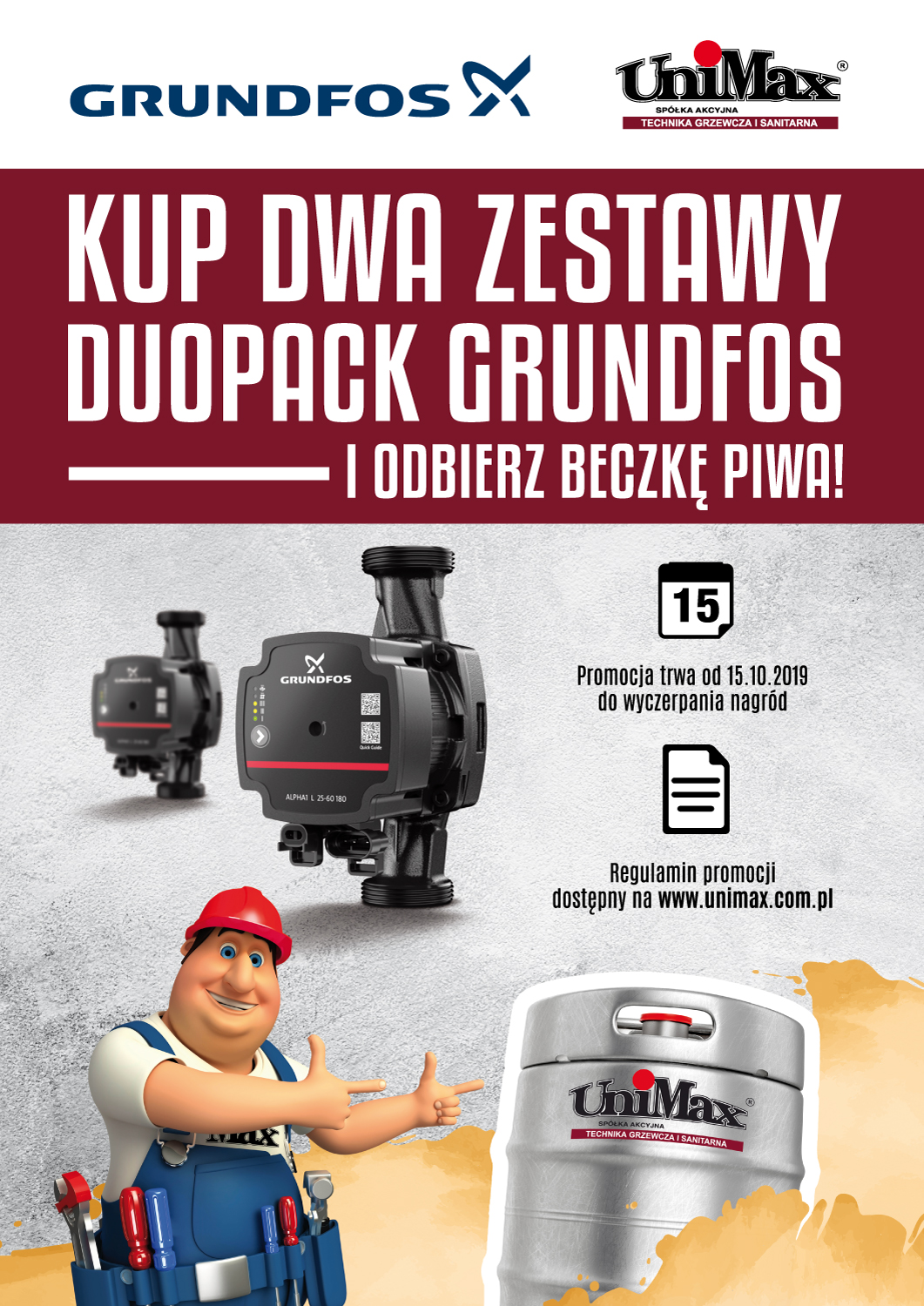 Klienci, kt贸rzy w czasie trwania promocji dokonaj膮 zakupu dw贸ch zestaw贸w Duopack Grundfos otrzymaj膮 nagrod臋 w postaci beczki piwa.