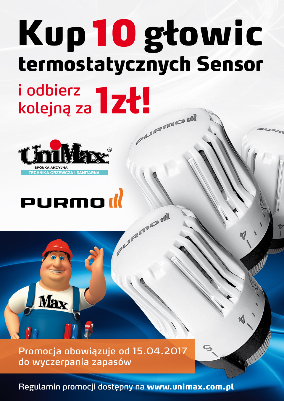 Dokonaj zakupu 10 g艂owic termostatycznych SENSOR w hurtowniach Unimax S.A. w okresie od 15 kwietnia 2017 roku i odbierz kolejn膮 g艂owic臋 w promocyjnej cenie 1 z艂 netto! Szczeg贸艂y promocji dost臋pne w regulaminie oraz u naszych sprzedawc贸w. Serdecznie zach臋camy do skorzystania z oferty promocyjnej!