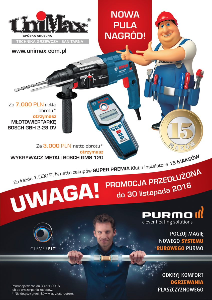 Już od 20 maja kupując produkty PURMO mogą Państwo otrzymać fantastyczne nagrody renomowanej firmy BOSCH. Kupując produkty PURMO za 3000 zł netto otrzymają Państwo wykrywacz metali BOSCH GMS 120, przy zakupie o wartości 7000 zł netto do zdobycia młotowiertarka BOSCH GBH 2-28 DV. Dodatkowo do każdego wydanego 1000 zł netto proponujemy Super Premię „Klubu Instalatora Unimax” w postaci 15 maxów!