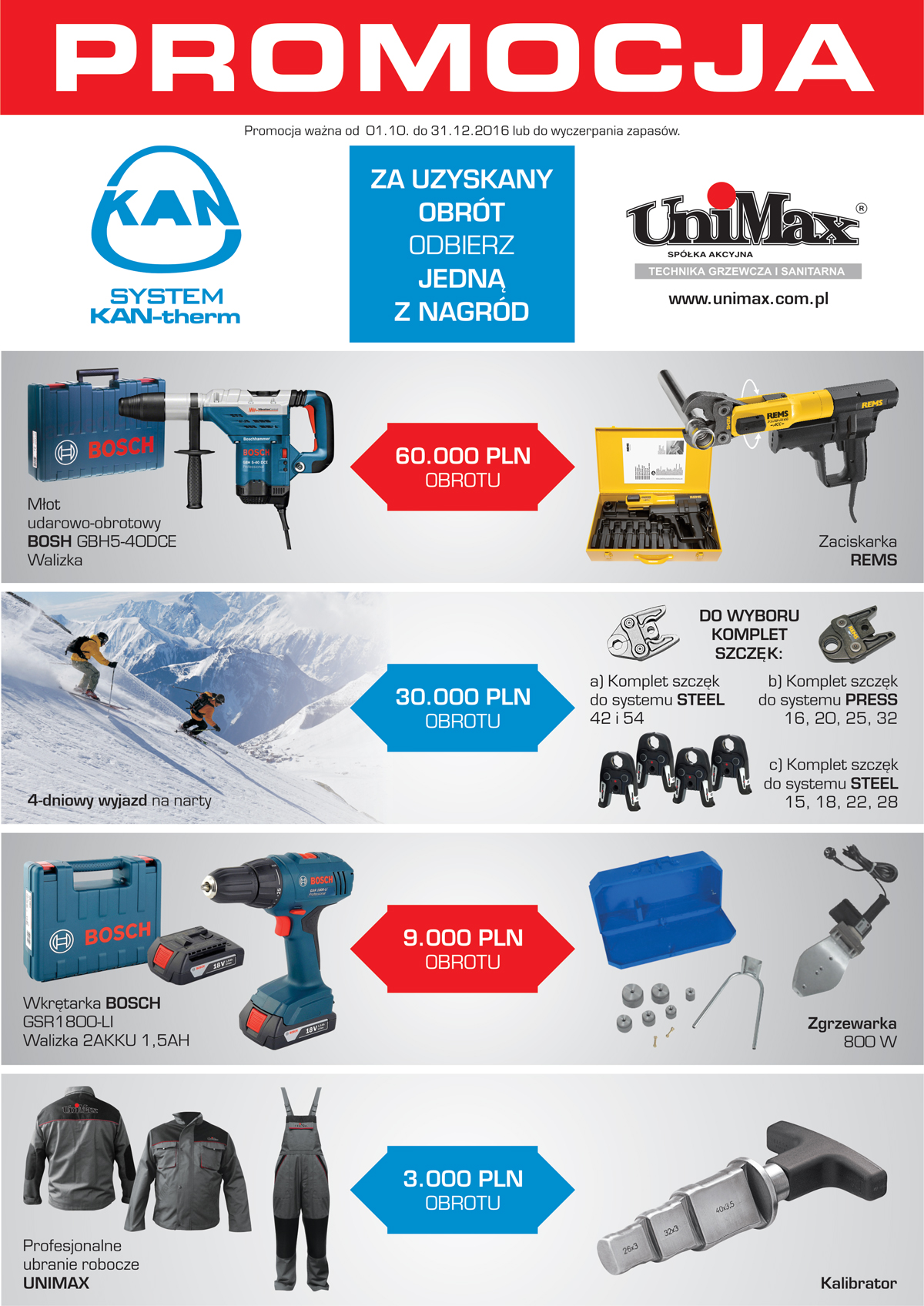 Aby cieszy膰 si臋 nagrodami wystarczy w okresie trwania promocji dokona膰 zakup贸w produkt贸w Kan w punktach sprzeda偶y Unimax S.A.聽o odpowiedniej warto艣ci. Do zdobycia: m艂ot udarowo-obrotowy, zaciskarka, 4-dniowy wyjazd na narty, komplet szcz臋k, wkr臋tarka, zgrzewarka, ubranie robocze i kalibrator.