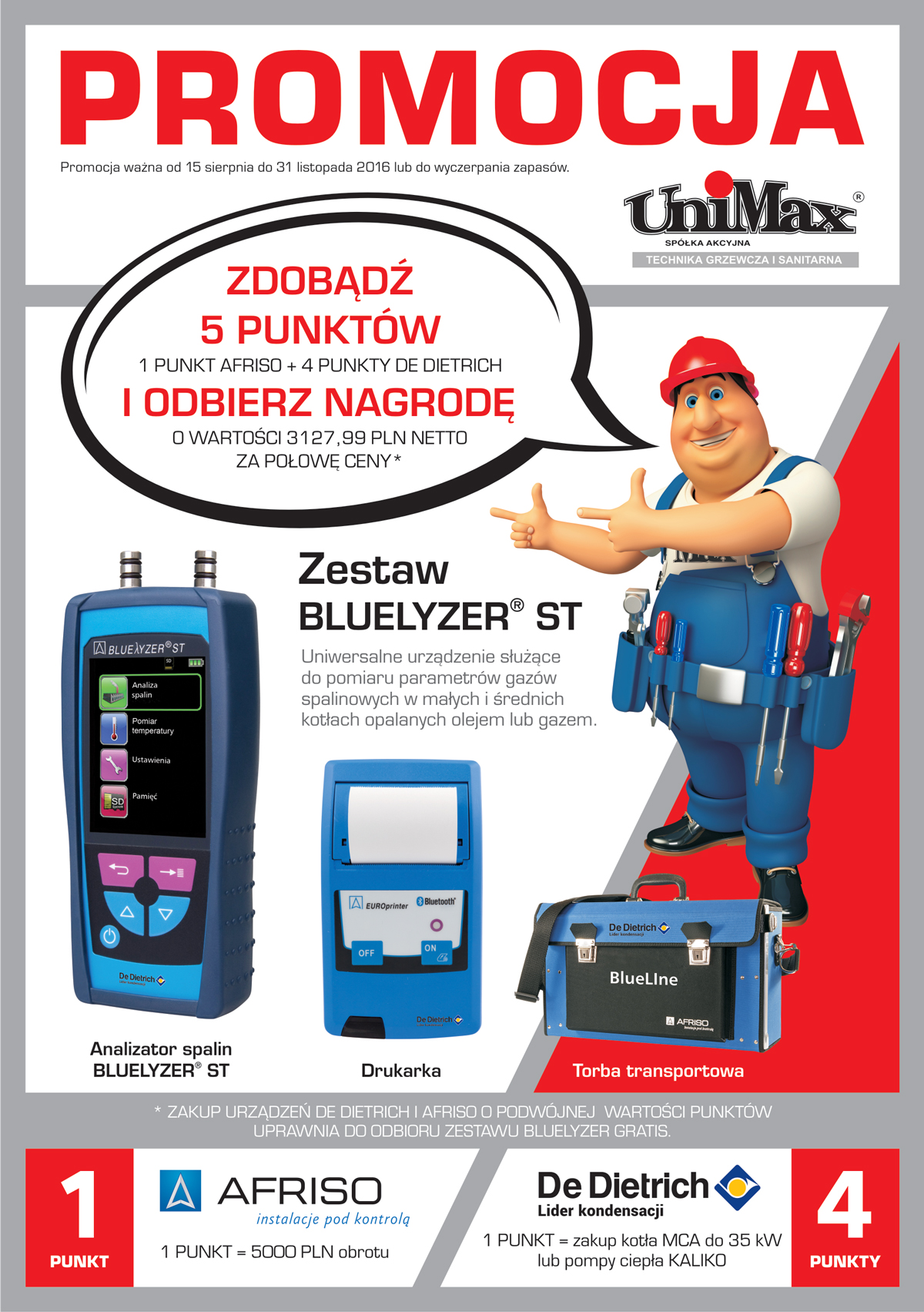 Ju偶 od 15 sierpnia kupuj膮c produkty AFRISO oraz聽kot艂y MCA do 35 kW i pompy ciep艂a KALIKO firmy De Dietrich mog膮 Pa艅stwo otrzyma膰 zestaw BLUELYZER ST za po艂ow臋 ceny katalogowej lub ca艂kowicie za darmo!